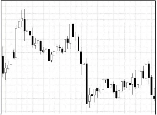- Svíčkový graf v černobílém provedení – zde je už obraz více plastický a orientace v grafu je jednodušší.