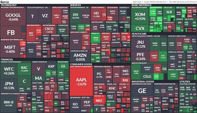 Akcie ve Spojených státech oslabily. Mohly za to hlavně ztráty společnosti Apple, která svým novým přístrojem iPhone 7 nenadchla analytiky a investory. Ztráty trhu částečně zbrzdil růst energetických firem. Index Dow klesl o 46,23 bodu, tedy 0,25 %, na 18 479,91 bodu. Širší index S&P 500 oslabil o 4,86 bodu, čili 0,22 %, na 2 181,30 bodu. Index technologického trhu Nasdaq Composite se snížil o 24,44 bodu (0,46 %) na 5 259,48 bodu. Index volatility VIX stoupl o necelých pět procent na 12,51 bodu a výnos 10letých vládních dluhopisů USA narostl o téměř šest bazických bodů na 1,5973 %.