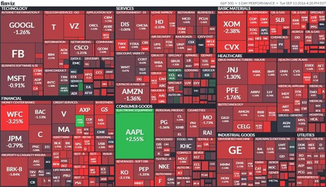 Pokles zaznamenaly takřka všechny akcie z indexu Dow, výjimkou byla ale společnost Apple, a to díky signálům silné poptávky po novém iPhonu 7.