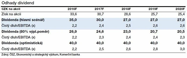 Vyloučit podle Němého ale nelze ani zachování výplaty dividendy ve výši 40 Kč na akcii (dividendový výnos více než 9 %). "Český stát by mohl tento přístup prosadit, protože dividendy ČEZ jsou důležitou součástí státního rozpočtu. V takovém scénáři by ovšem ukazatel čistého dluhu k EBITDA rostl výrazně rychleji a během několika let by mohl dosáhnout až úrovně 3, což by byla nadprůměrně vysoká úroveň v rámci sektoru," dodává Němý.