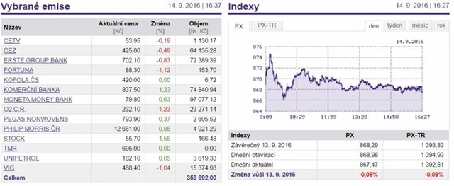 Index PX ve středu klesl o 0,09 % na 867,47 bodu.