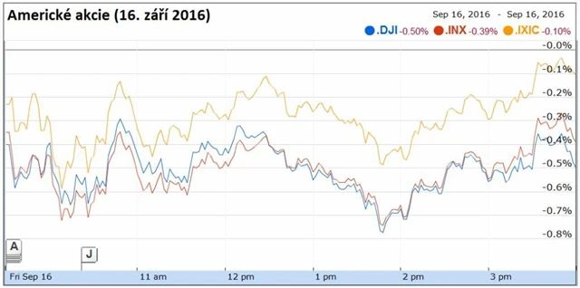 Index Dow v pátek klesl o 0,49 % na 18 123,80 bodu, širší S&P 500 oslabil o 0,38 % na 2 139,16 bodu a index technologického trhu Nasdaq Composite uzavřel na se ztrátou 0,1 % na 5 244,57 bodu. Index volatility VIX klesl o 5,71 % na 15,37 bodu a výnos 10letých vládních dluhopisů USA se mírně zvýšil na 1,693 %.