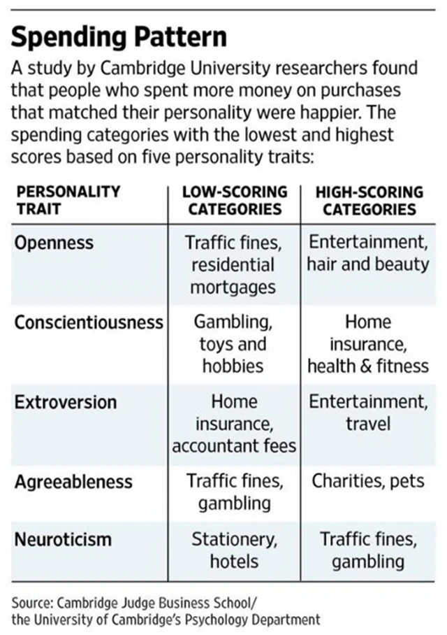 Štěstí lidí otevřených novým zkušenostem například podporují výdaje na zábavu. Svědomití jednotlivci jsou šťastnější, když utrácejí třeba za sport. Na náladu extrovertů pozitivně působí utrácení za cestování a přívětiví lidé se cítí spokojenější, když přispívají na charitu. Neurotikům pak činí potěšení věci, které ostatní nenávidí, například placení pokut.