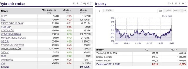 Nejobchodovanějším titulem páteční burzovní seance byly akcie Komerční banky. Jejich hodnota vzrostla o 0,3 procenta na 838,10 Kč. V plusu byla také konkurenční MONETA Money Bank, která si připsala 0,13 procenta na 80 korun za akcii. V mínusu naopak skončily oba rakouské finanční tituly. Cenné papíry bankovní skupiny Erste zlevnily o 0,71 procenta na 714,80 koruny. Akcie pojišťovny VIG zakončily obchodování s červenou nulou, když jejich cena klesla o 0,04 procenta na 486,70 Kč.