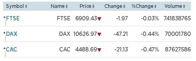 Podobně si vedly i indexy velkých západoevropských trhů, z nichž pouze britský FTSE 100 zůstal na "červené nule", zatímco německý DAX a francouzský CAC 40 odepisaly zhruba 0,4 procenta.