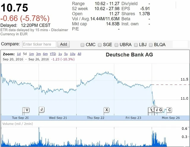 Americké ministerstvo spravedlnosti v polovině září oznámilo, že po Deutsche Bank požaduje, aby zaplatila 14 miliard dolarů za urovnání obvinění kolem prodeje hypotečních cenných papírů. Deutsche Bank uvedla, že takto vysokou částku zaplatit nehodlá.
