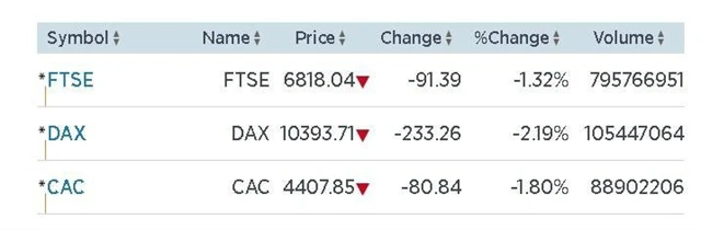 Celoevropský index STOXX Europe 600 zakončil obchodování o 1,5 % níže než při pátečním uzavření. Všechny evropské sektory a hlavní burzy končily v mínusu. Britský FTSE 100 klesl o 1,32 %, německý DAX odepsal 2,19 % a francouzský CAC 40 oslabil o 1,8 %.