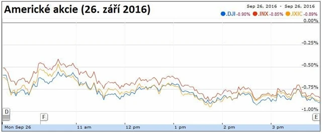 Americké akcie zahájily poslední zářijový týden poklesem. Investoři čekali, v čí prospěch vyzní první televizní debata prezidentských kandidátů Hillary Clintonové a Donalda Trumpa, a spekulovali o výsledku jednání ropného kartelu OPEC a dalších významných těžařů ropy v Alžírsku.