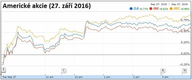 Americké akcie v úterý zaznamenaly solidní nárůst. Wall Street podpořil pocit řady investorů, že první televizní debatě prezidentských kandidátů dominovala demokratka Hillary Clintonová. Akciím ale pomohl také silný růst spotřebitelské důvěry v USA.