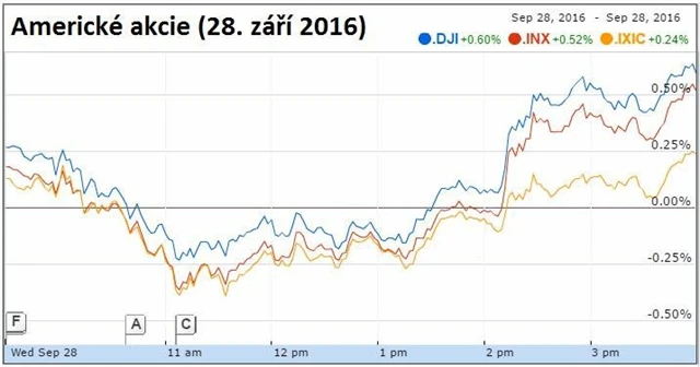 Americké akciové trhy ve středu znovu zpevnily, přestože na ně vyvíjí tlak nervozita před blížícími se listopadovými prezidentskými volbami. Náladu investorů podpořil prudký růst cen ropy po zprávách o nečekané dohodě ropného kartelu OPEC na snížení limitu těžby suroviny.