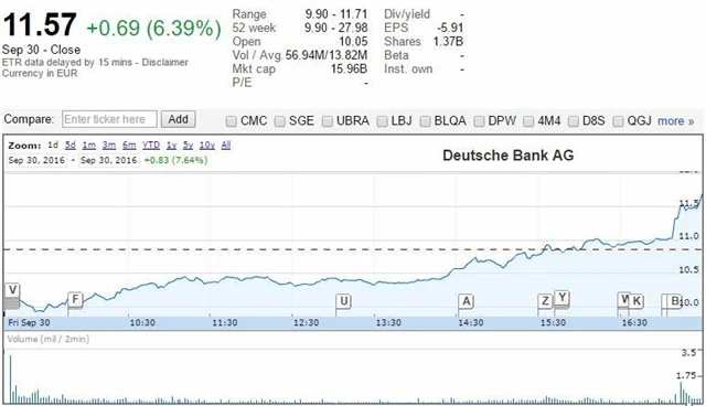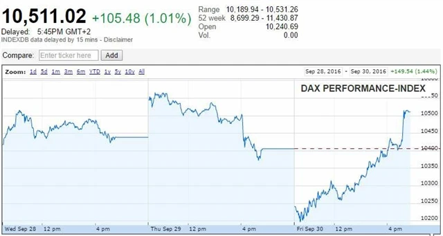 Evropa díky úspěšnému závěru nenásledovala asijský trend, kde v pátek velké trhy skončily pod nulou. Sentiment v celém regionu již několikátý den v řadě ovlivňovalo dění okolo německé Deutsche Bank. Její akcie po zahájení pátečního obchodování prudce oslabily a vůbec poprvé se ocitly pod hodnotou deset eur. Pokles zapříčinily zprávy, že hedgeové fondy ve Spojených státech omezily své obchody s bankou kvůli hrozbě vysoké pokuty, které Deutsche Bank čelí v USA. Odpoledne se však banka odrazila od pomyslného dna a nejen, že ztrátu vymazala, ale díky zprávě, že americké ministerstvo spravedlnosti s ní jedná o pokutě jen 5,4 miliardy dolarů, si nakonec připsala 6,39 %.