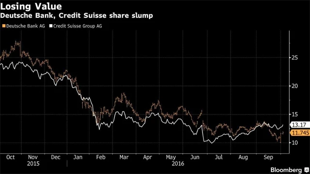 Tržní kapitalizace evropských bank se v letošním roce snížila o zhruba 280 miliard dolarů, přičemž Deutsche Bank ztratila téměř polovinu tržní hodnoty. Ještě minulý týden se akcie Deutsche Bank propadaly, momentálně díky spekulacím o blížící se dohodě s americkým ministerstvem spravedlnosti na nižší než původně avizované pokutě za prodej hypotečních cenných papírů před finanční krizí opět posilují.