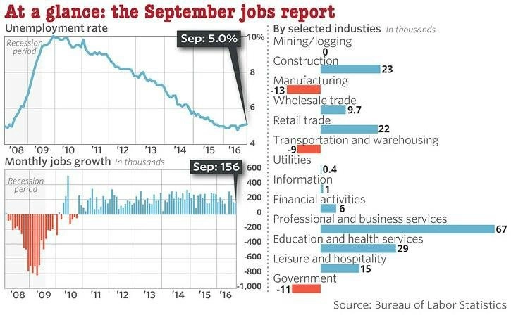 Americká ekonomika v září mimo zemědělství vytvořila zhruba 156 tisíc pracovních míst. Trh odhadoval, že vzniklo asi 175 tisíc míst po 167 tisících v červnu (revidováno ze 151 tisíc). Celková míra nezaměstnanosti vzrostla na 5 %, očekávala se stagnace na 4,9 %.