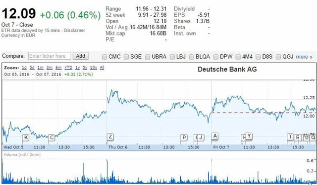 Akcie Deutsche Bank v pátek navázaly na trend z předcházejících dnů a připsaly 0,46 %. Za celý týden vyskočily o 6,22 %.