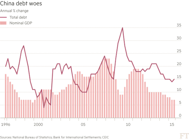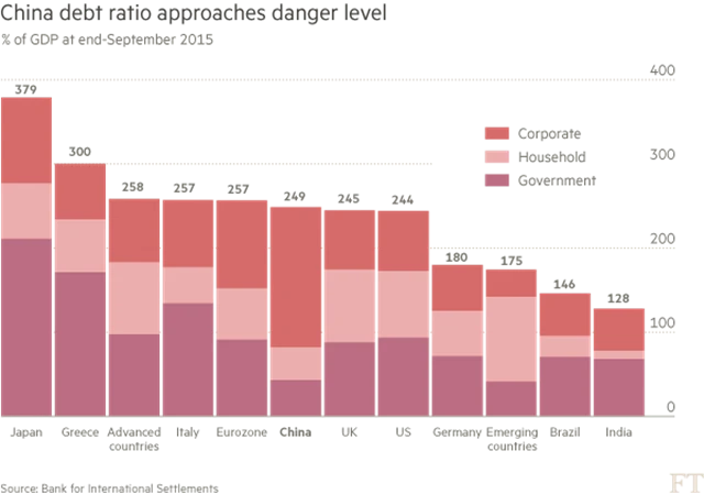 Dluh začíná být jednou z největších hrozeb pro Čínu. Celkové zadlužení země již stouplo na 250 % hrubého domácího produktu. Banka pro mezinárodní vyrovnání plateb (BIS) nedávno varovala, že nadměrný růst úvěrů v Číně signalizuje zvyšující se riziko vzniku bankovní krize v příštích třech letech. Mezinárodní měnový fond pak uvedl, že růst úvěrů v zemi je neudržitelný. Celkový dluh čínských firem podle MMF dosahuje 18 bilionů USD, což odpovídá zhruba 169 % HDP.