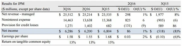 Zisk na akcii klesl na 1,58 USD z 1,68 USD před rokem. Analytici v anketě agentury Reuters počítali s propadem zisku na 1,39 USD na akcii. Celkové příjmy banky vzrostly o 8,4 % na 25,5 miliardy USD, zatímco analytici je odhadovali na méně než 24 miliard USD.