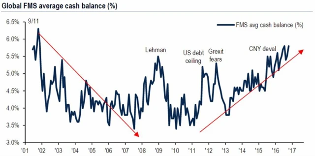 Obavy z krachu dluhopisového trhu, ze zhroucení globalizace či z nové krize v eurozóně? To mohou být jedny z důvodů, proč se v říjnu zvýšil podíl hotovosti na celkové hodnotě portfolií investičních fondů na 5,8 % z 5,5 % v předchozím měsíci. Vyšší hodnoty najdeme až při pohledu do vzdálenější minulosti, konkrétně v době krátce po teroristických útocích na americká dvojčata, tedy patnáct let nazpět.