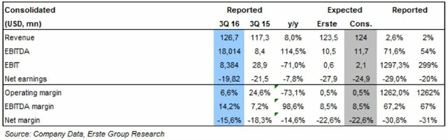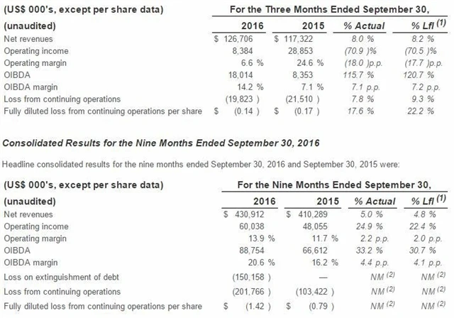 Za prvních devět měsíců roku společnost vykázala nárůst čistých tržeb o 4,8 % (při konstantních kurzech měn stouply čisté tržby o 5 %) na 430,91 milionu USD, nárůst provozního zisku OIBDA o 30,7 % (při konstantních kurzech měn o 33,2 %) na 88,75 milionu USD a zvýšení provozní OIBDA marže na 20,6 % z 16,2 %.