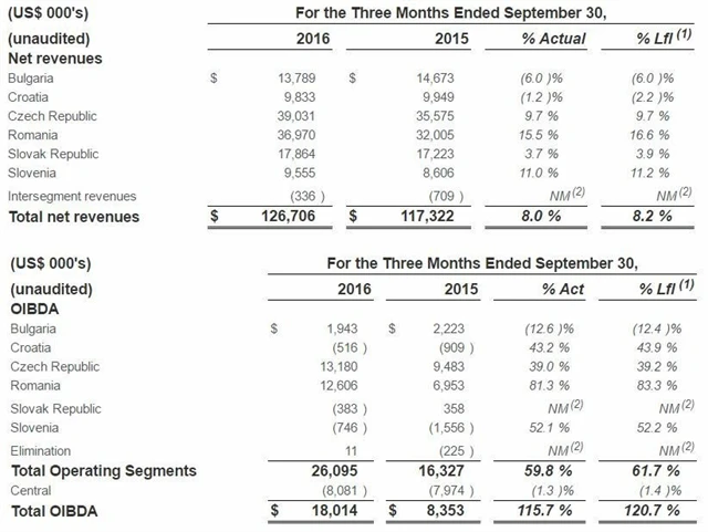 V samotné České republice společnosti tržby ve třetím čtvrtletí vzrostly meziročně o 9,7 % na 39,03 milionu USD a zisk OIBDA jí vyskočil o 39,2 % na 13,18 milionu USD. Při konstantních kurzech měn se čisté tržby na českém trhu zvýšily rovněž o 9,7 % a zisk OIBDA stoupl o 39 %.
