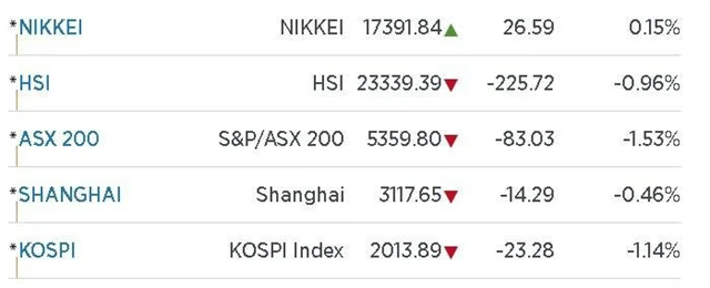 Japonský index Nikkei 225 byl mezi červenými čísly jedinou výjimkou, když si připsal nepatrný zisk 0,15 %.
