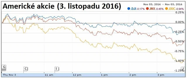 Investory znepokojují známky toho, že boj o prezidentský post mezi demokratickou kandidátkou Hillary Clintonovou a jejím republikánským rivalem Donaldem Trumpem je krátce před volbami velmi vyrovnaný. "Rostou obavy z toho, jak by mohlo Trumpovo prezidentství vypadat," říká analytik Ernie Cecilia z firmy Bryn Mawr Trust.