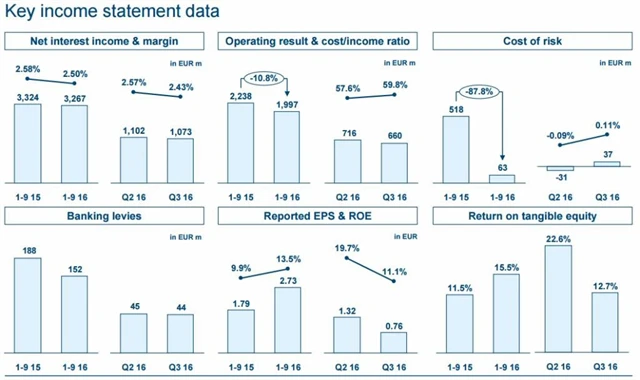 V samotném třetím čtvrtletí byl čistý úrokový příjem Erste 1,07 miliardy eur (3Q2015: 1,11 miliardy eur), příjem z poplatků a provizí činil 434,9 milionu eur (3Q2015: 455,2 milionu eur) a zisk z obchodních operací a aktiv oceňovaných reálnou hodnotou dosáhl 84,1 milionu eur (3Q2015: 56,4 milionu eur). Náklady na rizika se v samotném třetím čtvrtletí snížily na 37 milionů eur ze 144 milionů eur.