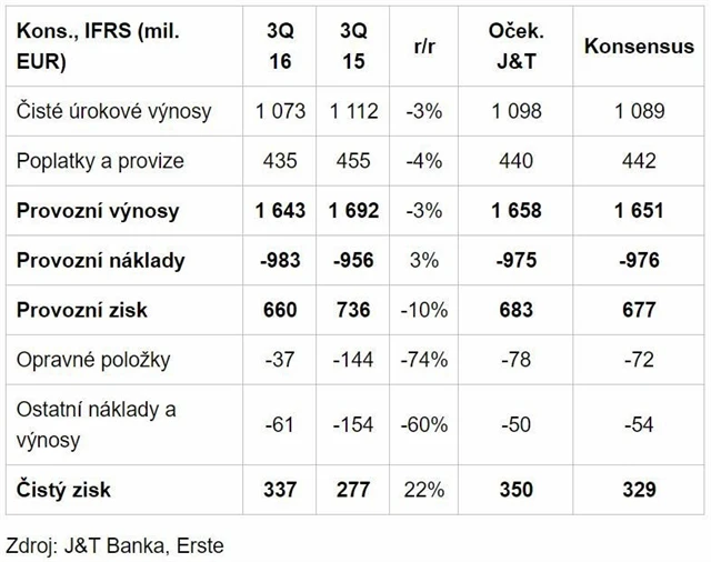 "Čistý úrokový výnos, provozní zisk i výnos z obchodování za třetí čtvrtletí mírně zaostaly za odhady. Pozitivem byla tvorba opravných položek ve výši 37,4 milionu eur, která byla proti odhadům poloviční. Čistý zisk pak jen lehce překonal očekávání, když dosáhl 337,4 milionu eur. Management potvrdil výhled pro letošní ukazatel ROTE, který by měl dosáhnout více než 12 %. Pro rok 2017 čeká ROTE nad 10 % za předpokladu, že k jednorázovému daňovému odvodu (asi 200 milionů eur) dojde již v letošním roce a výnosy budou v příštím roce alespoň na totožné úrovni jako letos," říká Miroslav Frayer, analytik z Komerční banky.