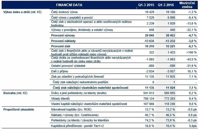 Česká spořitelna vykázala za první tři čtvrtletí čistý zisk 11,92 miliardy Kč. O rok dříve dosáhla ve stejném období čistého zisku 11,13 miliardy Kč. Meziročně jí tak zisk stoupl o 7,1 %. Hrubý objem klientských úvěrů se za posledních 12 měsíců zvýšil o 8,2 %, což v absolutním vyjádření znamená 44,3 miliardy Kč.