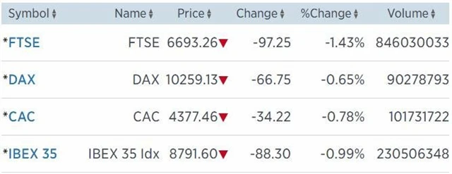 Regionální index STOXX Europe 600 odepsal 0,83 % na 328,81 bodu (za celý týden -3,52 %), britský FTSE 100 ztratil 1,43 % na 6 693,26 bodu (za celý týden -4,31 %), francouzský CAC 40 přišel o 0,78 % na 4 377,46 bodu (za celý týden -3,76 %) a německý index DAX klesl o 0,65 % na 10 259,13 bodu (za celý týden -4,09 %).