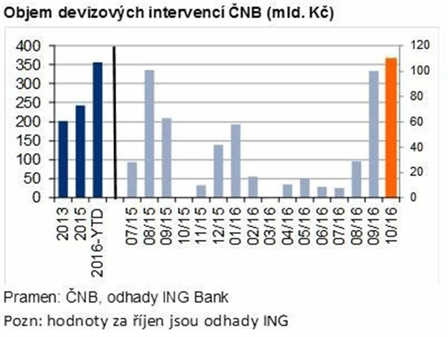"Tlak na kurzový závazek se s očekávaným koncem intervenční politiky zvyšuje. V posledních dvou měsících se intervence dostaly na nejvyšší hodnoty od zavedení intervenčního režimu. Zvyšující se poptávka po českých korunách a následné intervence ČNB jsou způsobeny jednak příznivým vývojem tuzemského exportu, postupně se zajištujícími firmami a rovněž sílícím přílivem spekulativního kapitálu, který předpokládá, že koruna po konci politiky slabé koruny posílí," říká Jakub Seidler, hlavní ekonom ING pro ČR.