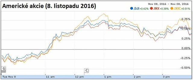 Americké akcie v den prezidentských voleb překonaly počáteční pokles a mírnými zisky nakonec navázaly na pondělní prudké oživení z devítidenní série ztrát. Wall Street povzbudily známky možného vítězství demokratické kandidátky na post prezidentky USA Hillary Clintonové.