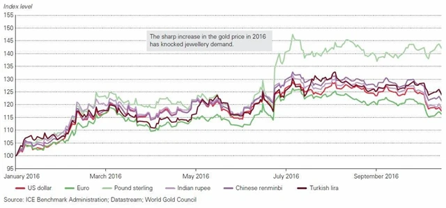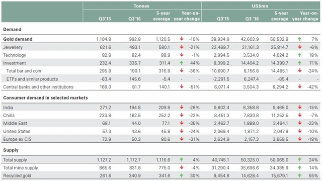 Aktivitu na trhu ve třetím kvartálu zvyšovaly výkyvy ceny kovu. Vysoká cena zlata přiměla k prodeji řadu spotřebitelů v Indii, zatímco ve Spojeném království se někteří investoři vstupem do zlata pojišťovali proti politickým a hospodářstvím rizikům, jež přineslo červnové rozhodnutí Britů vystoupit z Evropské unie.