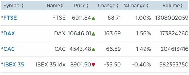 Regionální index STOXX Europe 600 zpevnil o 1,46 % na 339,81 bodu, německý DAX si připsal 1,26 % na 10 646,01 bodu, francouzský CAC 40 vzrostl o 1,49 % na 4 543,48 bodu a britský FTSE 100 si polepšil o 1 % na 6 911,84 bodu.