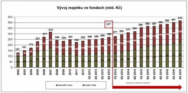 Nejvíce peněz je v dluhopisových (123 miliard Kč) a smíšených fondech (150,5 miliardy Kč). Hodnota majetku v zahraničních fondech stoupla od počátku roku na 192,1 miliardy Kč, domácí fondy vykázaly růst o dvacet miliard na 223,8 miliardy Kč.