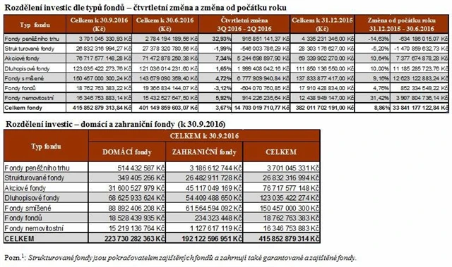 Nárůst majetku zaznamenaly dluhopisové fondy (+11,2 miliardy Kč), smíšené fondy (+12,6 miliardy Kč), nemovitostní fondy (+3,9 miliardy Kč), akciové fondy (+7,4 miliardy Kč) a fondy fondů (+0,9 miliardy Kč). Naopak pokles aktiv se projevil u fondů peněžního trhu (-0,6 miliardy Kč) a strukturovaných fondů (-1,5 miliardy Kč).