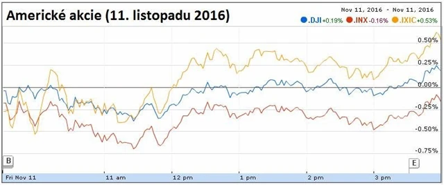 Americké akciové trhy v pátek pokračovaly v růstu vyvolaném vítězstvím republikána Donalda Trumpa v prezidentských volbách. Index Dow opět uzavřel na novém rekordu a za celý týden si připsal nejvýraznější zisk od prosince 2011. Obchodování však bylo na závěr týdne klidnější, protože trh s dluhopisy byl kvůli oslavám Dne veteránů zavřený.