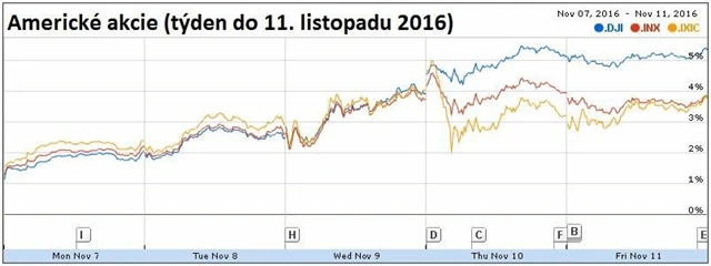 Za celý uplynulý týden Dow posílil o 5,36 %, S&P 500 přidal 3,8 % a Nasdaq Composite stoupl o 3,78 %. Analytici přitom predikovali, že v případě vítězství Donalda Trumpa v amerických prezidentských volbách trhy postihnou masivní výprodeje. Index malých podniků Russell 2000 za týden přidal dokonce více než deset procent, v pátek stoupl o 2,46 % na 1 282,38 bodu.