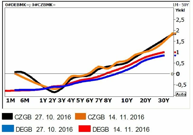 Minulý týden proběhly první tři aukce z listopadového emisního kalendáře českého ministerstva financí. MF v nich prodalo dluhopisy ve jmenovité hodnotě 11,5 miliardy Kč. Z toho 3letý dluhopis byl vydán v objemu 5 miliard Kč s průměrným výnosem -0,528 %, 7letý dluhopis v objemu 1,5 miliardy Kč s průměrným výnosem 0,181 % a 9letý dluhopis v objemu 5 miliard Kč s průměrným výnosem 0,388 %.