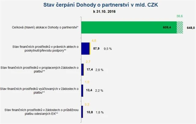 Z údajů ministerstva pro místní rozvoj vyplývá, že pro čerpání z evropských strukturálních fondů bylo v rámci programového období 2014-2020 ke konci října smluvně dohodnuto plnění v rozsahu jen necelých 10 % celkového balíku. Alikvóta by přitom činila zhruba 40 %. V odpovídajícím časovém bodě minulého programového období byl tento poměr kolem 28 %.