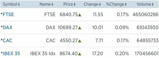 Za celý týden index STOXX Europe 600 zpevnil o 0,9 %. Britský FTSE 100 si v pátek polepšil o 0,17 % na 6 840,75 bodu (za celý týden se zvýšil o 0,96 %), francouzský CAC 40 rovněž stoupl o 0,17 % na 4 550,27 bodu (za celý týden +1,01 %) a německý DAX uzavřel se ziskem 0,09 % na 10 699,27 bodu (za celý týden +0,33 %).