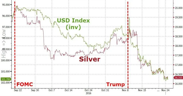 Během noci po amerických prezidentských volbách vyskočila cena stříbra na 19 dolarů za trojskou unci. Jakmile však opadl prvotní šok z vítězství Donalda Trumpa, který byl na trzích patrný jen několik hodin, vydala se cena kovu prudce dolů a zastavila se až těsně nad 16 dolary. Od začátku srpna, kdy se stříbro v obavách z rozhodnutí Britů vystoupit z Evropské unie vyšplhalo až k 21 dolarům, tak jeho cena spadla o více než 20 %, čímž byla naplněna definice začátku medvědího trendu.