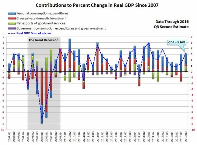 Výdaje spotřebitelů, které se na celkové ekonomické aktivitě v USA podílejí asi dvěma třetinami, vzrostly o 2,8 %. To je o 0,7 procentního bodu více, než uváděl rychlý odhad. Výdaje za nebytovou výstavbu, které zahrnují i výdaje na ropné vrty, se zvýšily o 10,1 %, nejrychleji od prvního čtvrtletí 2014. Původní údaje počítaly se zvýšením o 5,4 %.
