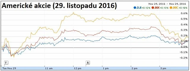 Americké akcie v úterý mírně posílily a index technologického trhu Nasdaq Composite se během dne vyšplhal na nové maximum. Náladu investorů podporovaly příznivé údaje o vývoji americké ekonomiky. Ropa před středečním klíčovým jednáním kartelu OPEC výrazně zlevnila.