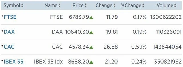 Britský FTSE 100 si připsal 0,17 % na 6 783,79 bodu (za celý měsíc -3,04 %), francouzský CAC 40 zpevnil o 0,59 % na 4 578,34 bodu (za celý měsíc +0,71 %) a německý index DAX získal 0,19 % na 10 640,30 bodu (za celý měsíc -0,52 %).