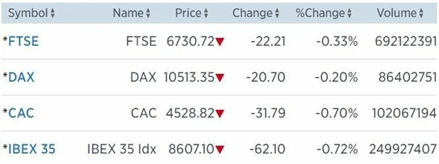 Regionální index STOXX Europe 600 klesl o 0,44 % na 339,36 bodu (za celý týden -0,9 %), když většina jeho sektorů skončila v mínusu. Britský FTSE 100 odepsal 0,33 % na 6 730,72 bodu (za celý týden -1,47 %), francouzský CAC 40 ztratil 0,7 % na 4 528,82 bodu (za celý týden -0,47 %) a německý index DAX přišel o 0,2 % na 10 513,35 bodu (za celý týden -1,74 %).