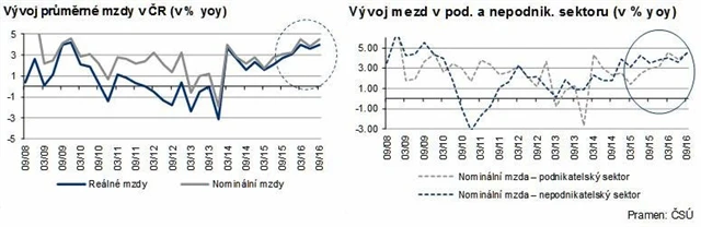 "Mzdy se v letošním roce vyvíjejí nad očekávání příznivě díky výkonnosti ekonomiky, poklesu nezaměstnanosti k historickým minimům a nedostatku vhodné pracovní síly, která nutí firmy zvyšovat mzdy k jejímu získání a udržení. Obavy centrální banky týkající se přenosu nízké inflace na mzdová vyjednávání a slabý růst mezd se tak nenaplňují. Za celý letošní rok by měly mzdy v nominálním vyjádření vzrůst o 4,2 %, což je nejvyšší hodnota od roku 2008, kdy mzdy stouply o 7,9 %. V příštím roce by pak měla dynamika mezd dále mírně zrychlit, nicméně vzhledem k postupnému zvyšování průměrné inflace (z +0,6 % v letošním roce na +1,8 % v příštím roce) bude růst reálných mezd v příštím roce pomalejší. Začátkem příštího roku dojde k dalšímu růstu minimální mzdy, a to ze současných 9 900 Kč na 11 000 Kč. Tento více než 10% nárůst se mírně projeví i v celkové dynamice mezd za příští rok a navýší růst o několik desetin procentního bodu," dodává Seidler.