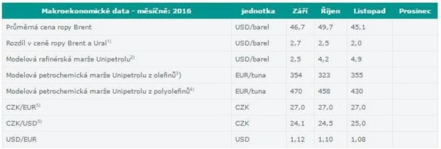 Petrochemický holding Unipetrol zveřejnil modelové marže za listopad. V rafinérském segmentu se marže zvýšila na 4,9 USD za barel z 4,2 USD v říjnu. Rozdíl mezi cenou ropy Brent a Ural klesl na 2 USD z 2,5 USD na barel. Olefinová marže dosáhla 355 eur za tunu (říjen: 323 eur za tunu), polyolefinová marže byla 430 eur za tunu (říjen: 458 eur za tunu).