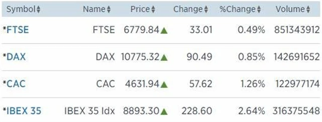 Regionální index STOXX Europe 600 zpevnil o 0,97 % na 344,57 bodu. Většina jeho sektorů skončila v plusu, nedařilo se však bankovním akciím. Britský FTSE 100 zpevnil o 0,49 % na 6 779,84 bodu, francouzský CAC 40 vyskočil o 1,26 % na 4 631,94 bodu a německý index DAX vzrostl o 0,85 % na 10 775,32 bodu.