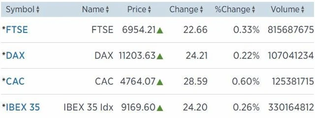 Regionální index STOXX Europe 600 zpevnil o 0,97 % na 355,38 bodu (za celý týden +4,72 %), když skoro všechny jeho sektory skončily v pozitivním pásmu. Britský FTSE 100 si připsal 0,33 % na 6 954,21 bodu (za celý týden +3,35 %), francouzský CAC 40 vzrostl o 0,6 % na 4 764,07 bodu (za celý týden +5,19 %) a německý index DAX stoupl o 0,22 % na 11 203,63 bodu (za celý týden +6,57 %).