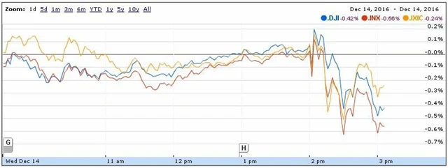Americké akcie zahájily středeční seanci na nule a do oznámení výsledku zasedání měnového výboru Fedu se všechny tři hlavní indexy pohybovaly ve velmi úzkém pásmu. Po oznámení, že základní úroková sazba americké centrální banky vzroste na 0,5-0,75 %, ale indexy rychle spadly pod nulu, byť se utažení měnové politiky všeobecně očekávalo. Analytici se shodují, že pokles je reakcí na odhad Fedu, že v příštím roce se základní úrok zvýší třikrát. Euro se k americkému dolaru přechodně dostalo pod úroveň 1,05.